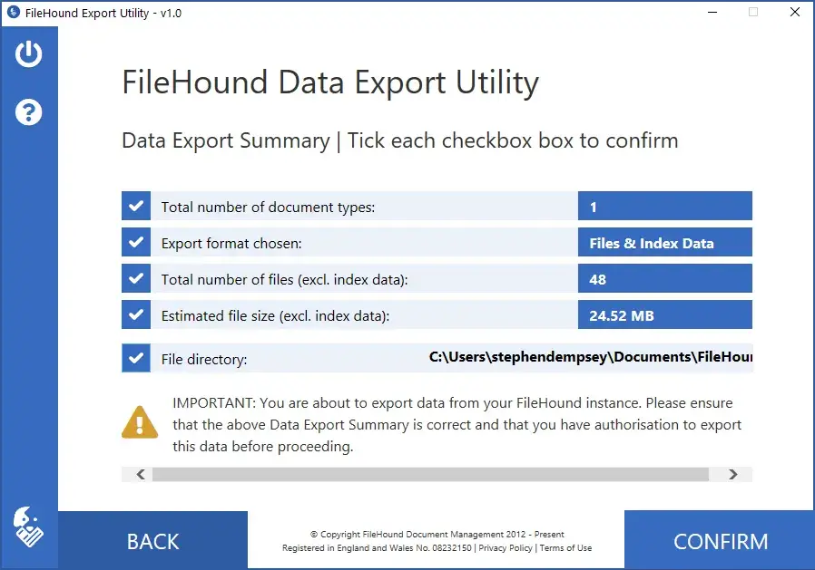 L'utilitaire d'exportation FileHound permet aux administrateurs FileHound d'exécuter des tâches sécurisées d'extraction de documents et de données à des fins alternatives de sauvegarde et de récupération. Cette application téléchargera tous les documents et/ou métadonnées enregistrés dans FileHound en fonction des filtres que vous avez choisis. Les métadonnées seront exportées dans les formats JSON et XML.