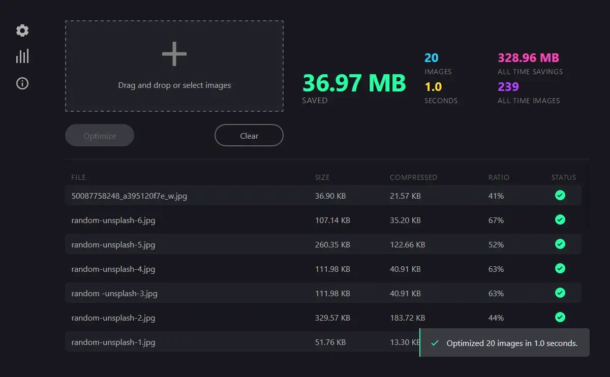 CommunityShowcase옵티머스(Optimus)버전: v2.10옵티머스(Optimus) Optimus 데스크탑 이미지 최적화 애플리케이션입니다. WebP, JPEG, PNG 이미지 포맷 형식간의 변환 및 압축을 지원합니다.